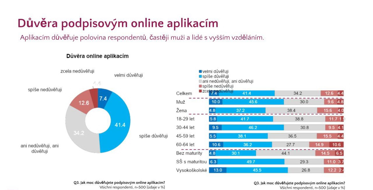 Podpisovým online aplikacím důvěřuje přibližně 50 % respondentů, přičemž tento trend je častější u mužů než u žen. S rostoucím věkem dochází k poklesu důvěry v online aplikace, zatímco s vyšším vzděláním roste i důvěra v tyto technologie. Zkušenost s podepisováním online dokumentů má 77 % osob ve věku 18–64 let, přičemž častěji se s těmito aplikacemi setkávají vysokoškolsky vzdělaní jednotlivci (89 %) a osoby ve věku 30–44 let (85 %). Nejčastějšími oblastmi využití online podpisu jsou komunikace s bankami (46 %) a podepisování pracovních dokumentů či smluv (43 %).