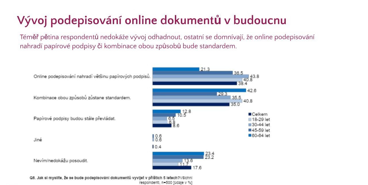 Téměř 40 % lidí se domnívá, že online podpisy brzy zcela nahradí tradiční papírové dokumenty, zatímco dalších 35 % předpokládá, že v budoucnu bude běžnou praxí kombinace obou formátů. Zatímco respondenti s vyšším vzděláním vnímají budoucnost jako čistě digitální, starší generace zůstává k těmto změnám spíše skeptická.