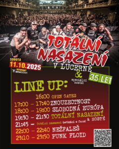Na oslavě svých 35. narozenin se tak ve dvouhodinovém koncertním bloku představí Totáči mimo tradičního současného složení Sváťa, P.P.Cvok a Martin také ve starších sestavách z nejrůznějších období existence kapely a raritní set nejen pro pamětníky bude víc než vydatný. Kromě bývalých členů si Totální nasazení pozvalo také další hosty, kdy v roli gratulantů vystoupí legendární slovenská Slobodná Európa a neméně legendární Znouzectnost, které doplní spřízněné a spřátelené kapely Nežfaleš a Punk Floid. Akce začíná už v pět hodin, končí před půlnocí a porce muziky to bude víc než řádná. A proč si Totáči vybrali znovuvelký sál pražské Lucerny?