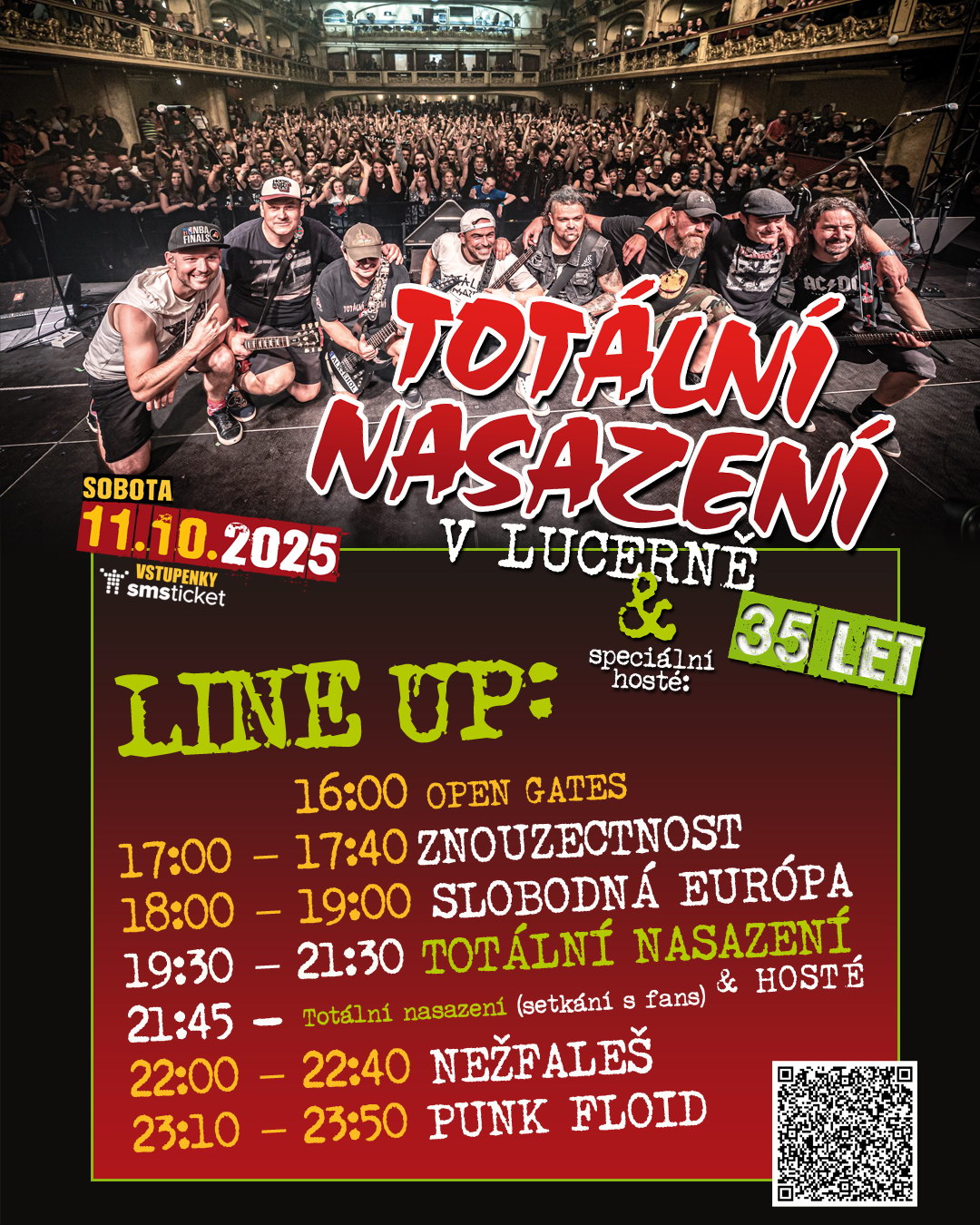 Slánská punk-rocková parta TOTÁLNÍ NASAZENÍ slaví letos na podzim 35 let od vzniku a protože v kapele vždy panovaly velmi přátelské vztahy se všemi svými bývalými členy, domluvila se celá tato parta kamarádů, že tyhle pětatřicátiny oslaví společně a že si po letech zopakují mejdan ve velkém sále pražské Lucerny.
