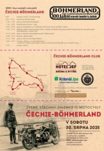 V pátek 29. srpna v 9.30 vyjede od Národního technického muzea v Praze pět motocyklů Čechie-Böhmerland na sraz do Krásné Lípy. Akci uskuteční rodinný klan pana Jiřího Zezulky z Horních Počernic, dlouholetého sběratele a milovníka značky Čechie-Böhmerland. Téměř stoleté motocykly pojedou celou trasu v běžném provozu a po vlastní ose. Jádrem slavnostního srazu bude defilé zúčastněných strojů na Křinickém náměstí v Krásné Lípě s prohlídkou venkovní výstavy věnované motocyklům Čechie-Böhmerland a jejich tvůrci. Z časových důvodů tudíž nebude možno dodržet tradiční itinerář srazu.