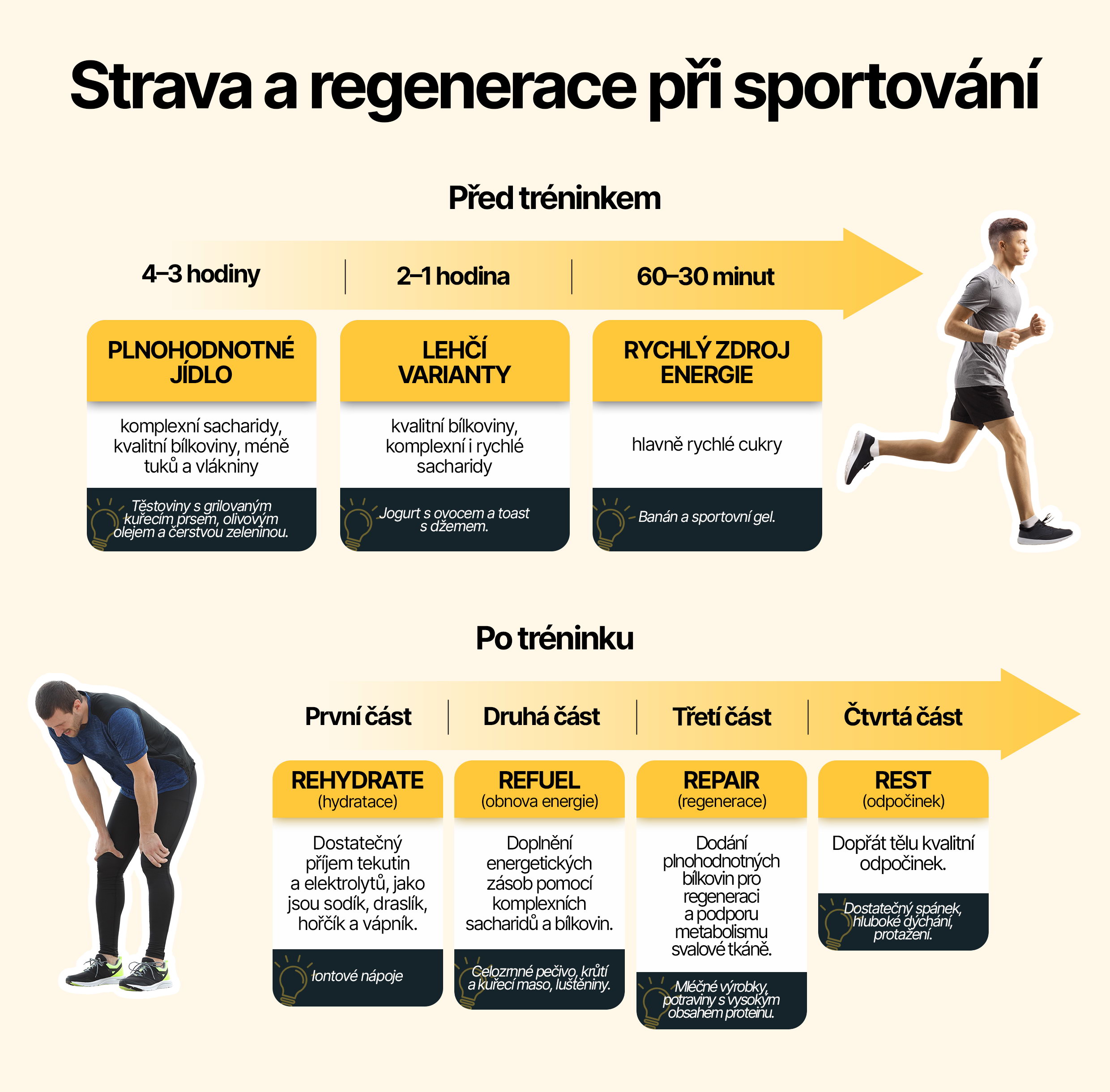 Strava by se navíc měla odvíjet od aktuální fáze tréninku. Specialistka Štejdířová vysvětluje, že před zátěží je důležité optimalizovat zásoby glykogenu v játrech a svalech, předejít poklesu krevního cukru, minimalizovat pocit hladu během výkonu a zajistit správnou hydrataci: „Pokud máme 3–4 hodiny před tréninkem, ideální volbou je plnohodnotné jídlo s komplexními sacharidy, kvalitními bílkovinami a menším množstvím tuku a vlákniny – například těstoviny s grilovaným kuřecím prsem, olivovým olejem a čerstvou zeleninou. Pokud zbývá do tréninku 1–2 hodiny, vhodnější jsou lehčí varianty, jako jogurt s ovocem nebo toast s džemem. V posledních 30–60 minutách před sportem je ideální rychlý zdroj energie, například sportovní gel, banán nebo nápoj s menším množstvím sacharidů.“
