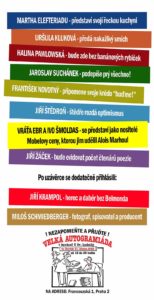 Kompletní abecední seznam podepisujících účastníků je zveřejněn v březnových Ebrovinách a a vystaven ve výloze kavárny u sv. Ludmily. Každý z nich byl písemně a pak telefonicky pozván a přislíbili svoji účast. V daném termínu některý z nich přijde „na chvíli“, jiný na delší dobu, ostatní na celé odpoledne až do 20. hodiny. Ochotně budou rozdávat svoje podpisy, případně i fotografie nebo vizitky; možná někteří i svoje knížky…