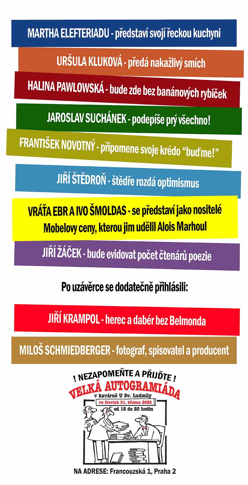 Ve čtvrtek 31. března odpoledne od 15 do 20 hodin v Kavárně U sv. Ludmily – Francouzská 1. Přihlásilo se celkem přes 100 populárních i zatím méně známých osobností – spisovatelů, básníků, ilustrátorů, herců a dalších.